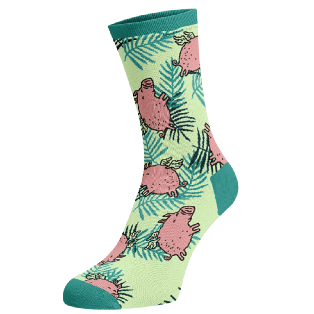 “Lendav põrsas” sokid on rõõmsameelse disainiga, kaunites värvitoonides ja nahasõbralikud. Ühevärvilised elemendid kandadel ja varvastel on tugevdatud polüamiidiga, et vältida kulumist. Sokkide kaelal olev elastaaniriba aitab sokkidel jalas püsida ilma survet tekitamata.
