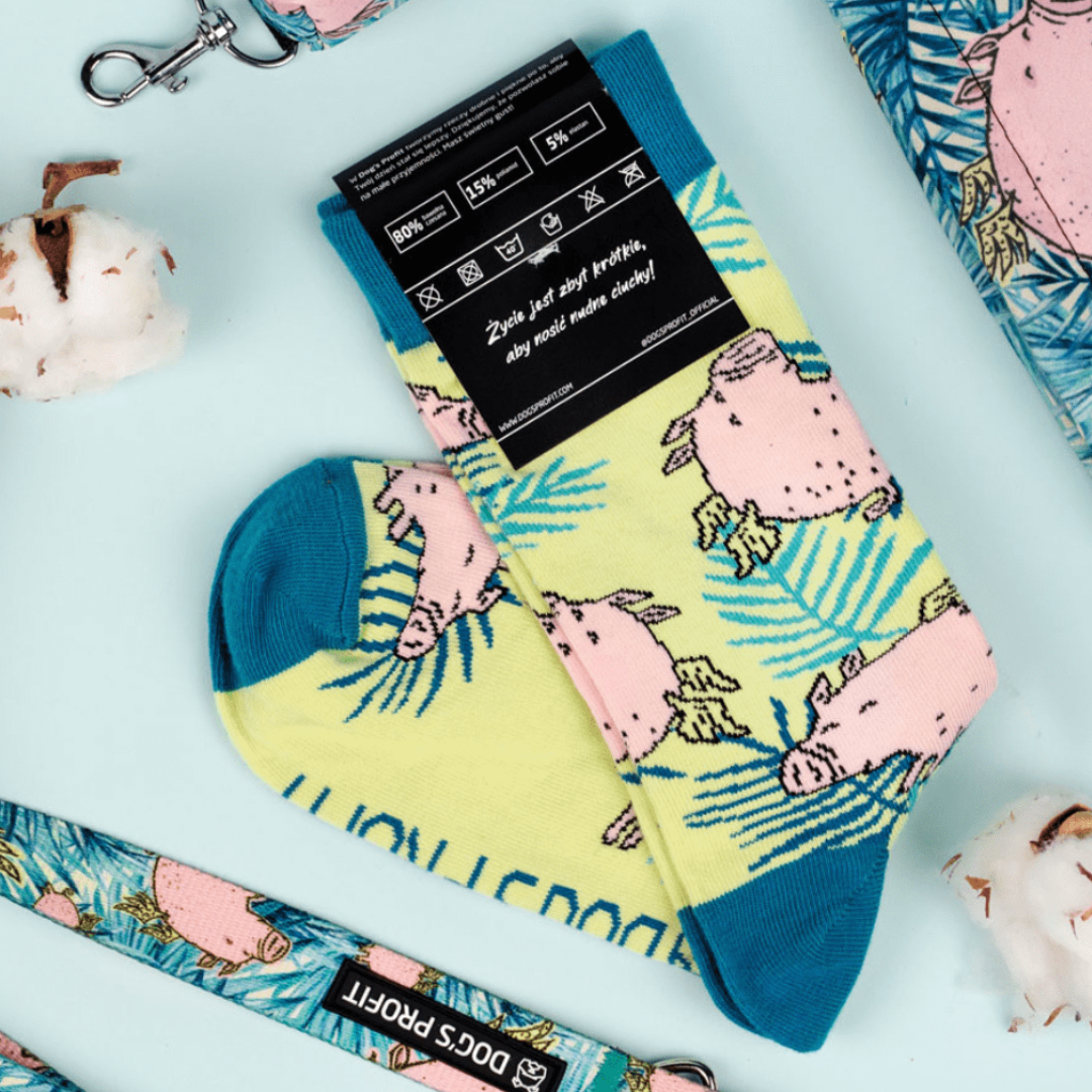 DOCKSY “Lendav põrsas” kõrged sokid koeraomanikele on rõõmsameelse disainiga ja valmistatud kvaliteetsest OEKO-TEX sertifikaadiga puuvillast. Nahasõbralikud, hingavad ja mugavad sokid püsivad hästi jalas ning sobivad ideaalselt koera rihmakomplekti stiilseks täienduseks.